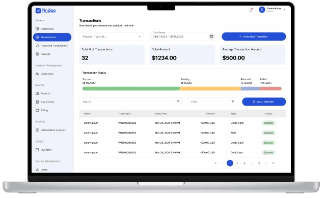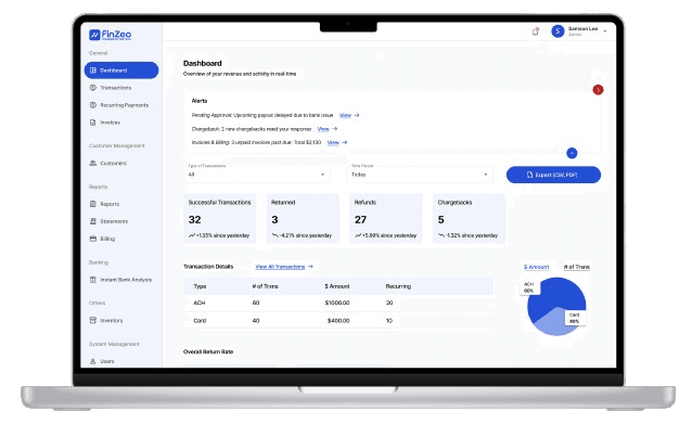 Top-level filters for transaction type/date range plus revenue overviews, refined charts for returns/recurring/SFTP, and real-time batch tables reduce clutter while highlighting trends.
